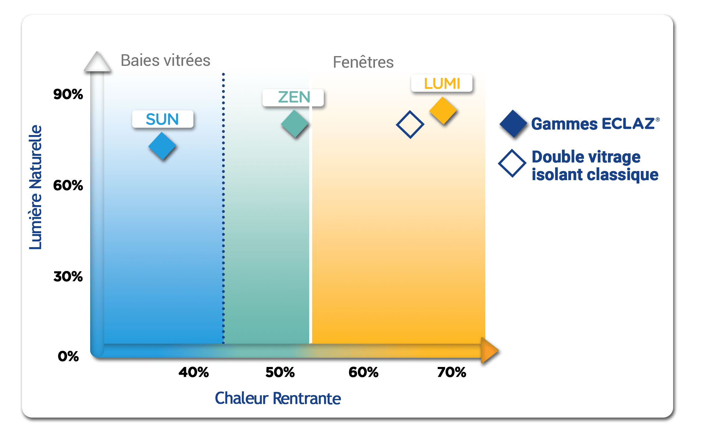 Grâce à une technologie innovante et brevetée, ECLAZ® LUMI est le double vitrage le plus transparent et laisse passer 6 % de chaleur solaire de plus qu’un double vitrage isolant classique.